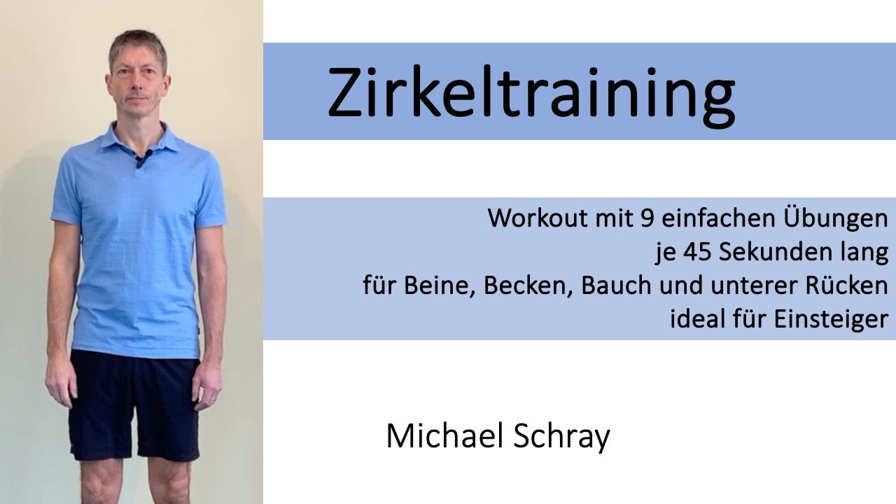 Besuchen Sie mich auf Youtube. Sie finden Videos für ein Zirkeltraining mit dem Schwerpunkt Beine, Becken, Bauch und unterer Rücken und ein Zirkeltraining mit dem Schwerpunkt Kopf, Schultern, Arme und oberer Rücken. Weitere Mitmach-Angebote sind in Planung.